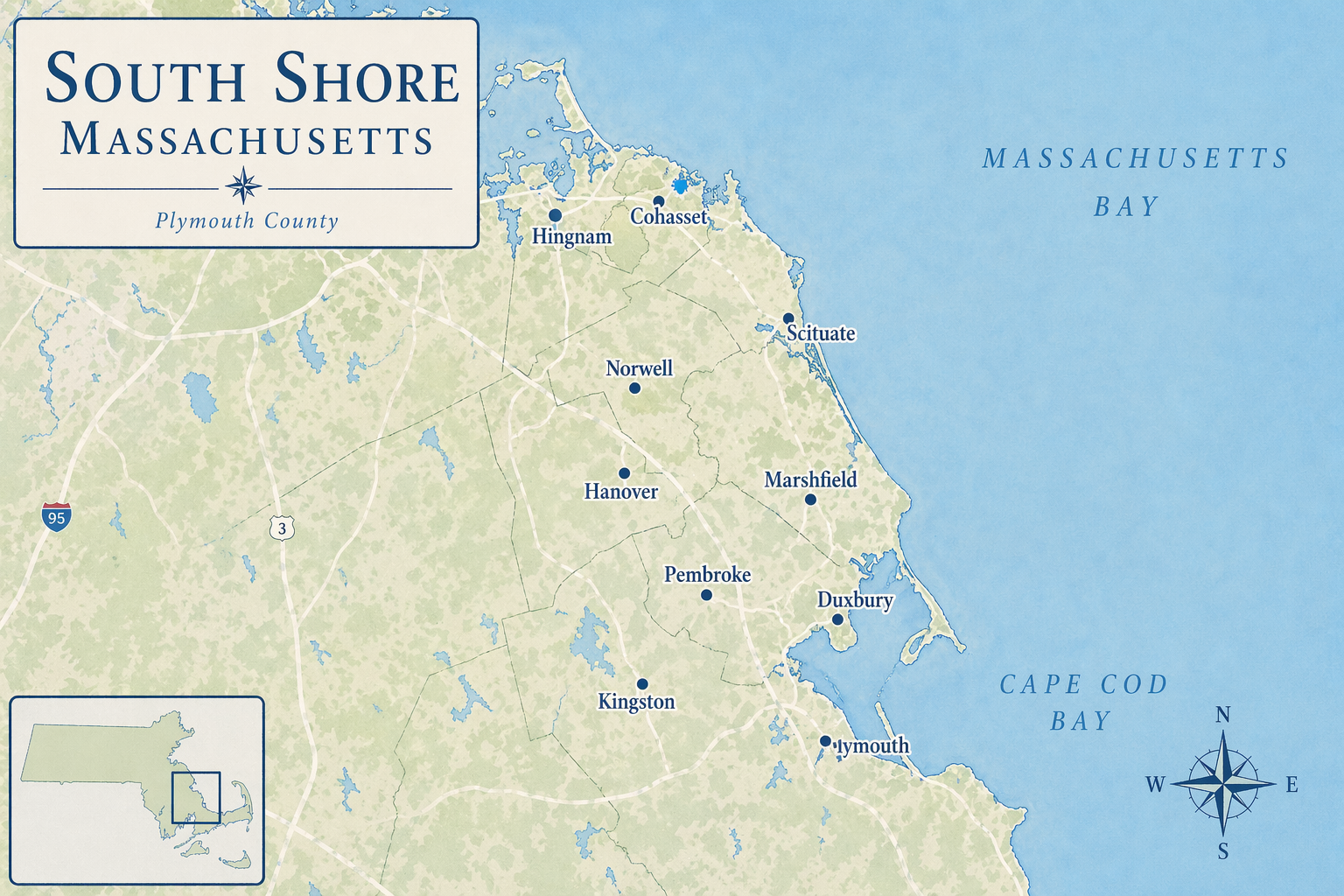 Kerry also assists clients throughout the South Shore of Massachusetts, including the cities highlighted on the map: